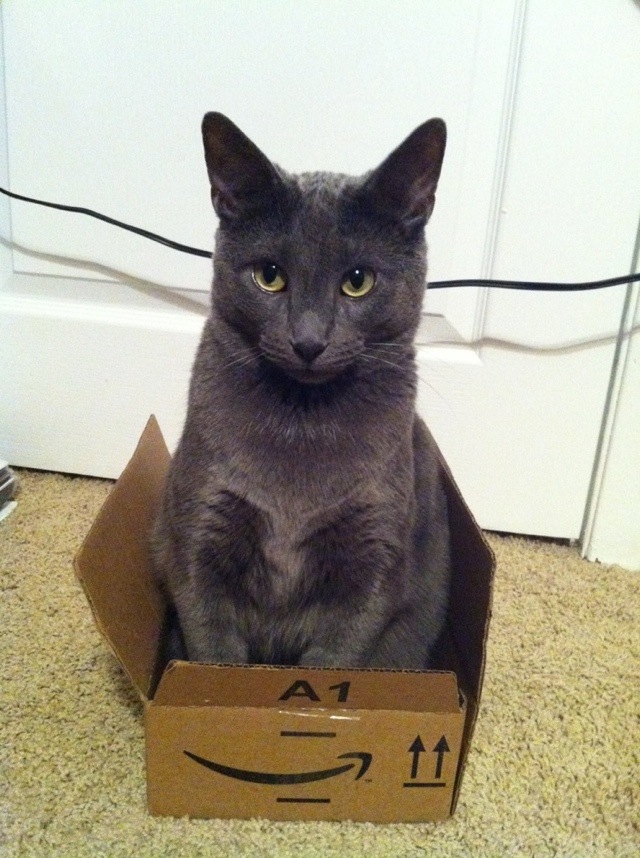 Omi likes to sit in boxes, especially small boxes, ones that don’t look like he’d fit in them. This one is an Amazon box, so he’s now being called ‘Amazon Kitty’, haha.