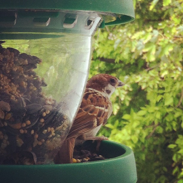 I’ve been noticing birds fly up on the deck quite a bit, so I bought a bird feeder for them. It’s just a small one, but I think I might have to upgrade to a bigger one after seeing how many have started flocking to it. There were at least 11 at once at different times during the day. A dove even showed up to nibble at the seeds that had fallen on the deck. It didn’t stay for long, though, because a certain Fatty-meow decided to charge at it through the glass, haha.