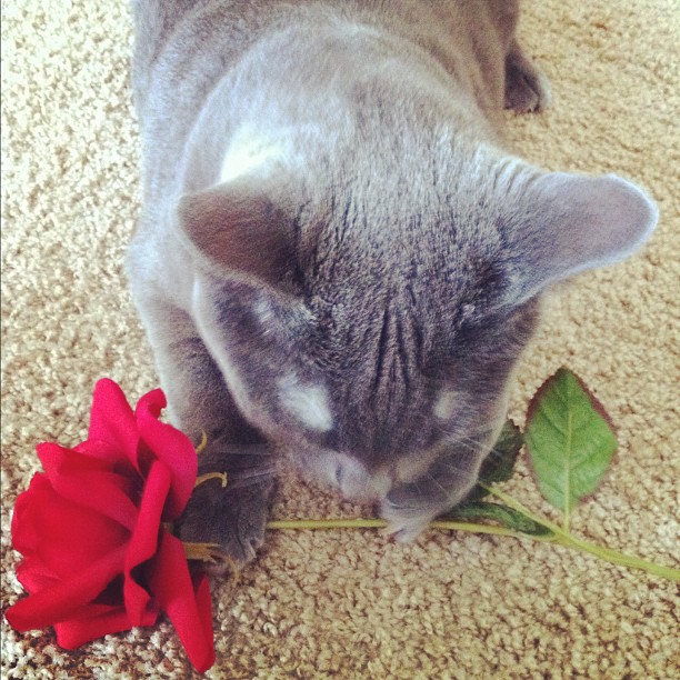 Speaking of, Phantom seems to love that more birds are showing up on the deck. He gets a lot of bird watching in during the day now. I forgot to get a picture of him watching his birds, but here’s one of him with his favorite toy, a fake rose. He became attached to it as a kitten and likes to carry this around the house.